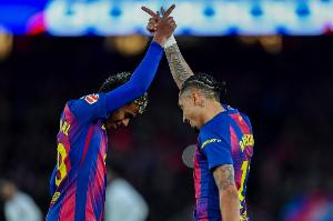 24直播网3月16日讯 在本轮西甲巴萨对阵塞维利亚的比赛中,拉菲尼亚上演帽子戏法。