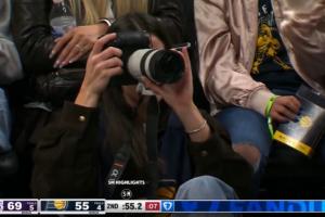 24直播网3月26日讯 NBA常规赛,步行者对阵湖人,克拉克客串场边的摄影师。