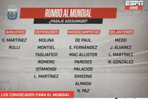 24直播网03月26日讯 据ESPN阿根廷版报道,阿根廷世界杯名单中已有20名球员锁定席位,剩余的6个名额将由16名球员争夺。