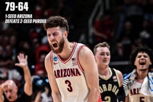 24直播网3月29日讯 今天结束的一场NCAA锦标赛8强战,亚利桑那大学79比64击败普渡大学,晋级4强。