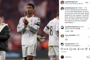 24直播网4月18日讯 本轮欧冠八强战次回合,皇马在客场3-4被拜仁双杀。中场贝林厄姆在赛后通过社媒发文。