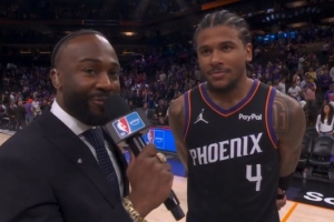 24直播网4月18日讯 NBA附加赛,太阳111-96击败勇士,赛后杰伦·格林在赛场边接受了媒体采访,以下为采访全文。