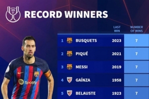 24直播网4月19日讯 德国转会市场统计了球员国王杯夺冠次数,并列出榜单,布斯克茨、皮克、梅西等5名球员7冠居首,前10名中,有8名球员在巴萨夺得过国王杯冠军。
