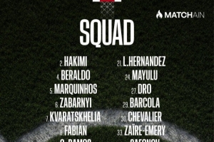 24直播网4月19日讯 北京时间明天凌晨,巴黎将在法甲第30轮比赛中主场对阵里昂,巴黎公布了此役的球员名单,法比安回归,努诺·门德斯缺席。