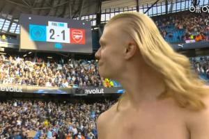 24直播网04月20日讯 曼城本轮2-1击败阿森纳,哈兰德赛后脱去上衣,现在是金发美人哈兰德!