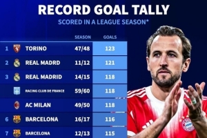 24直播网4月20日讯 拜仁在本轮德甲4-2击败斯图加特,本赛季联赛进球已109球,《转会市场》统计显示拜仁单赛季进球数暂时位列五大联赛球队历史第12位。
