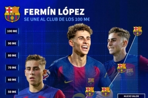 24直播网3月17日讯 德国转会市场更新社媒动态,晒出了巴萨中场费尔明身价变化图。