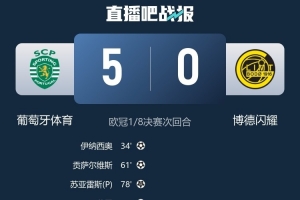 24直播网3月18日讯 欧冠1/8决赛次回合,葡萄牙体育主场对战博德闪耀,最终葡萄牙体育成功完成让三追五,经过加时赛最终5-0击败对手,总比分5-3晋级欧冠八强。