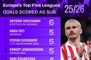 24直播网3月20日讯 本赛季,马竞老将格列兹曼依然保持着良好的状态,尽管西蒙尼主要将他作为替补使用。本赛季迄今为止,格列兹曼在西甲中替补登场已打进6球,位居五大联赛所有球员之首。
