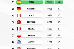 24直播网3月20日讯 欧战1/8决赛战罢,媒体列出了本赛季各联赛欧战积分排名,英超24.791分居首,只需要一场平局就能锁定额外欧冠席位,西甲20.281分次席,6支球队晋级欧战8强形势大好。