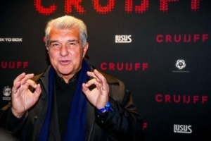 24直播网3月22日讯 据《每日体育报》报道,成功实现连任的巴萨主席拉波尔塔出席了俱乐部传奇克鲁伊夫纪录片的首映礼。