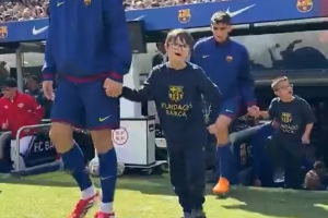 24直播网3月22日讯 西甲第29轮比赛,巴萨在诺坎普迎战巴列卡诺。本场比赛之前,巴萨球员手牵唐氏综合症球童走进球场,表达了对他们的关爱。