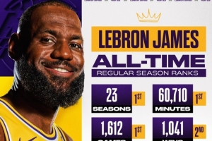 24直播网3月23日讯 今天,NBA官方晒出詹姆斯一系列的常规赛数据。具体如下: