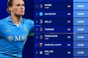24直播网3月24日讯 德国转会市场公布了新一期的意甲球员身价情况,并且盘点了在意甲效力的英国球员身价情况,麦克托米奈以4500万欧居首。